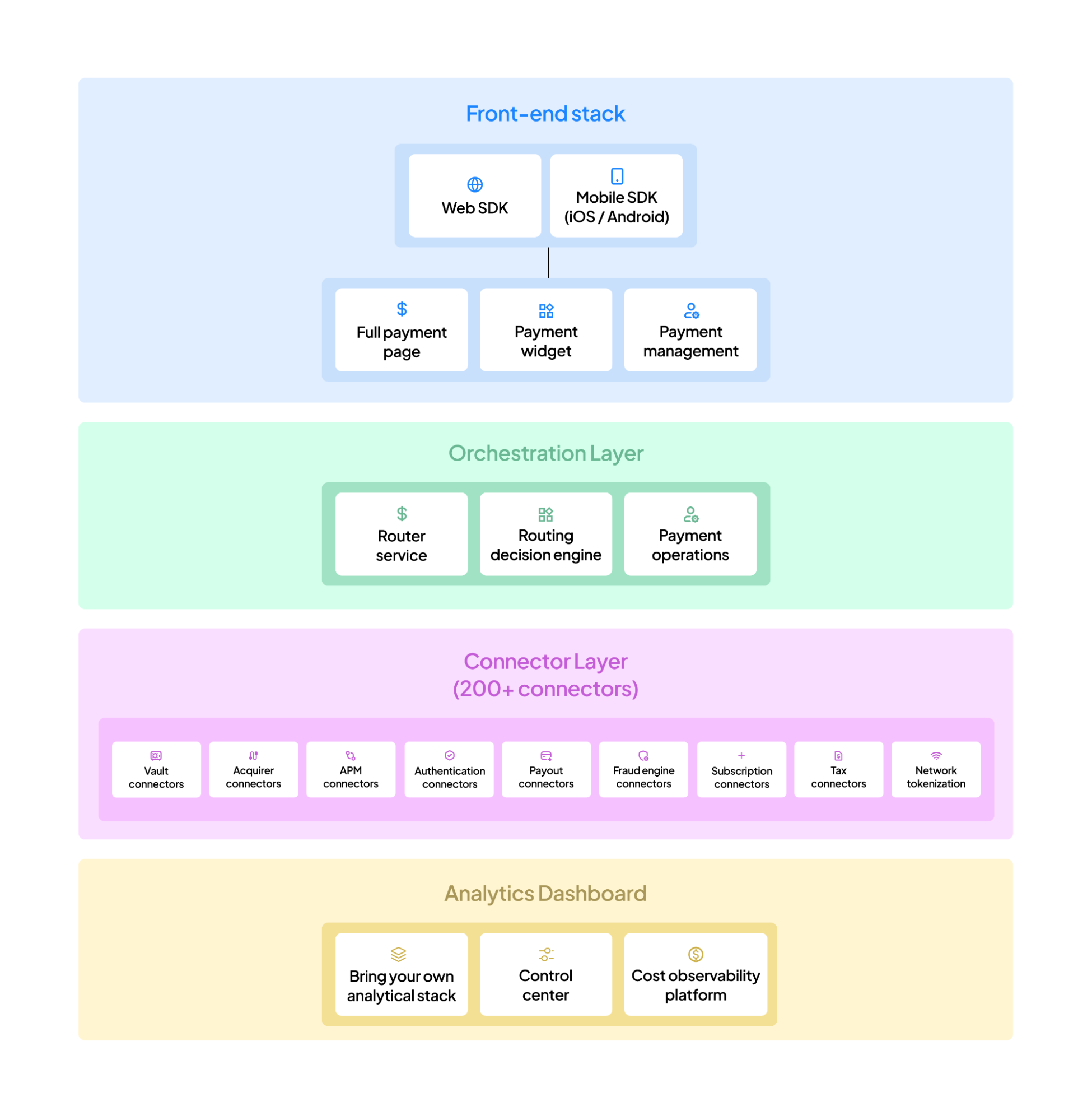 When we say full-stack, we mean a payments platform that brings together four core layers: front‑end SDKs, orchestration workflows, reporting and analytics dashboard, and a broad connector layer. Each of these layers solves a different part of the payments problem, but they are designed to work as a single system rather than as isolated tools.