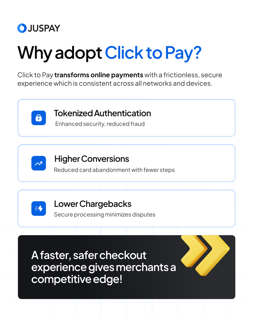 These challenges are considerable, particularly for companies with legacy infrastructure, international customers, or constrained resources. This is where a technology service provider (TSP) such as Juspay comes into play. Juspay, known for its experience-focused approach, provides effortless integration with current infrastructure, guaranteeing compliance with international data security protocols such as PCI DSS and GDPR, along with strong fraud protection capabilities. TSPs that cater to all stakeholders (Merchants, Networks, users) have strategic advantage through deeper market insights and help with faster Go live through its Reliable, scalable, and affordable software offerings. Juspay's offerings make it the ideal partner for businesses seeking to navigate the complexities of Click to Pay and deliver a secure, hassle-free payment experience for both staff and customers.