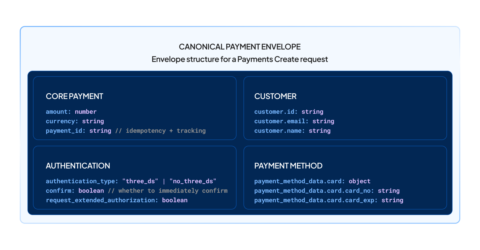 The canonical envelope is powerful because it turns the moving parts of payments into signals rather than separate integration tracks. This allows platforms to evolve without introducing new code paths. Concretely, the canonical envelope is just a JSON body your backend sends to POST /payments. Here’s what that looks like in practice: