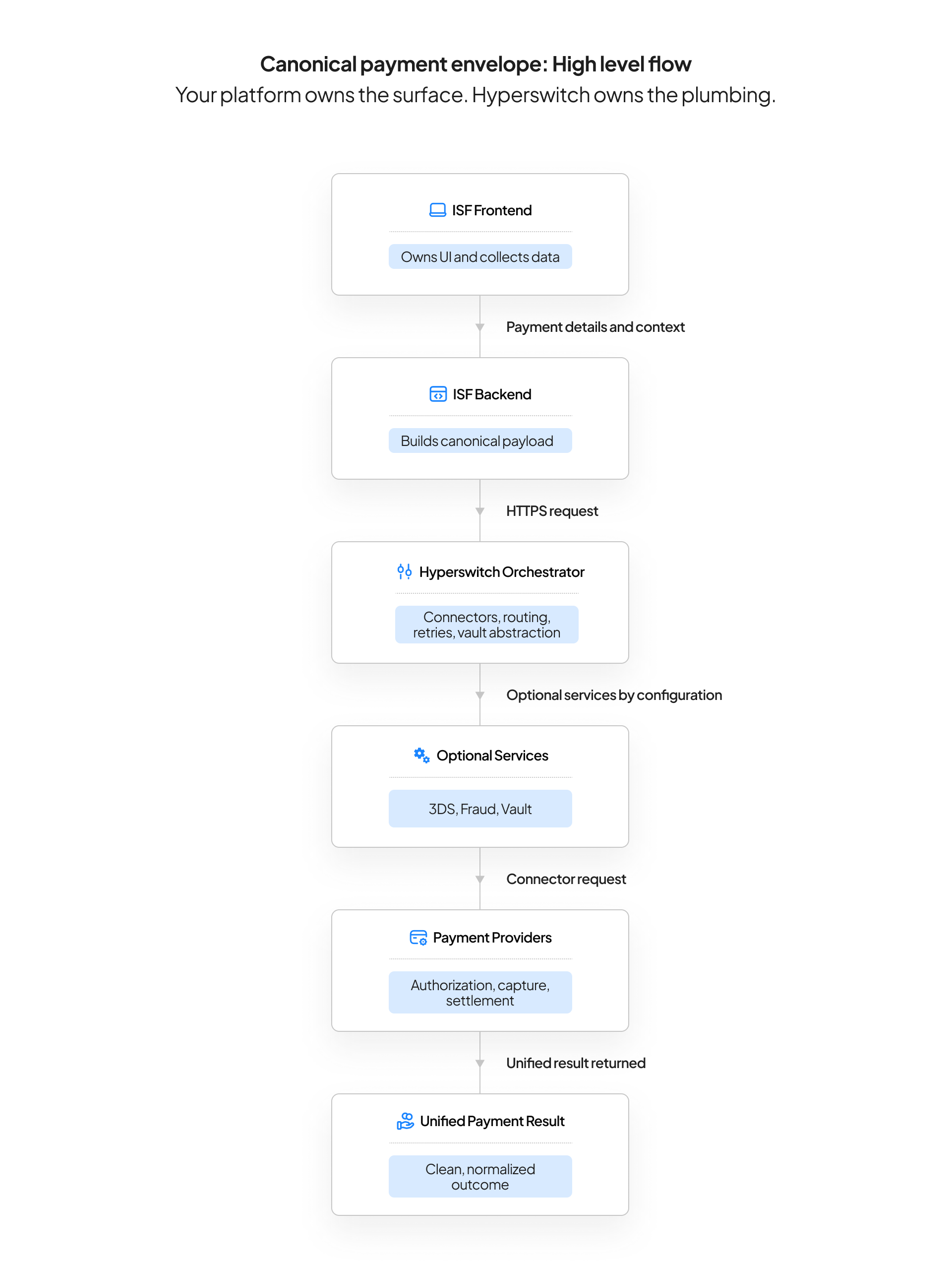 Your merchants continue to interact with the experience they already trust. You retain ownership of the entire customer surface. Hyperswitch takes responsibility for the orchestration beneath it. With the canonical envelope defined, the next step is understanding how it actually moves through the system. The diagram below maps the full journey end-to-end:
