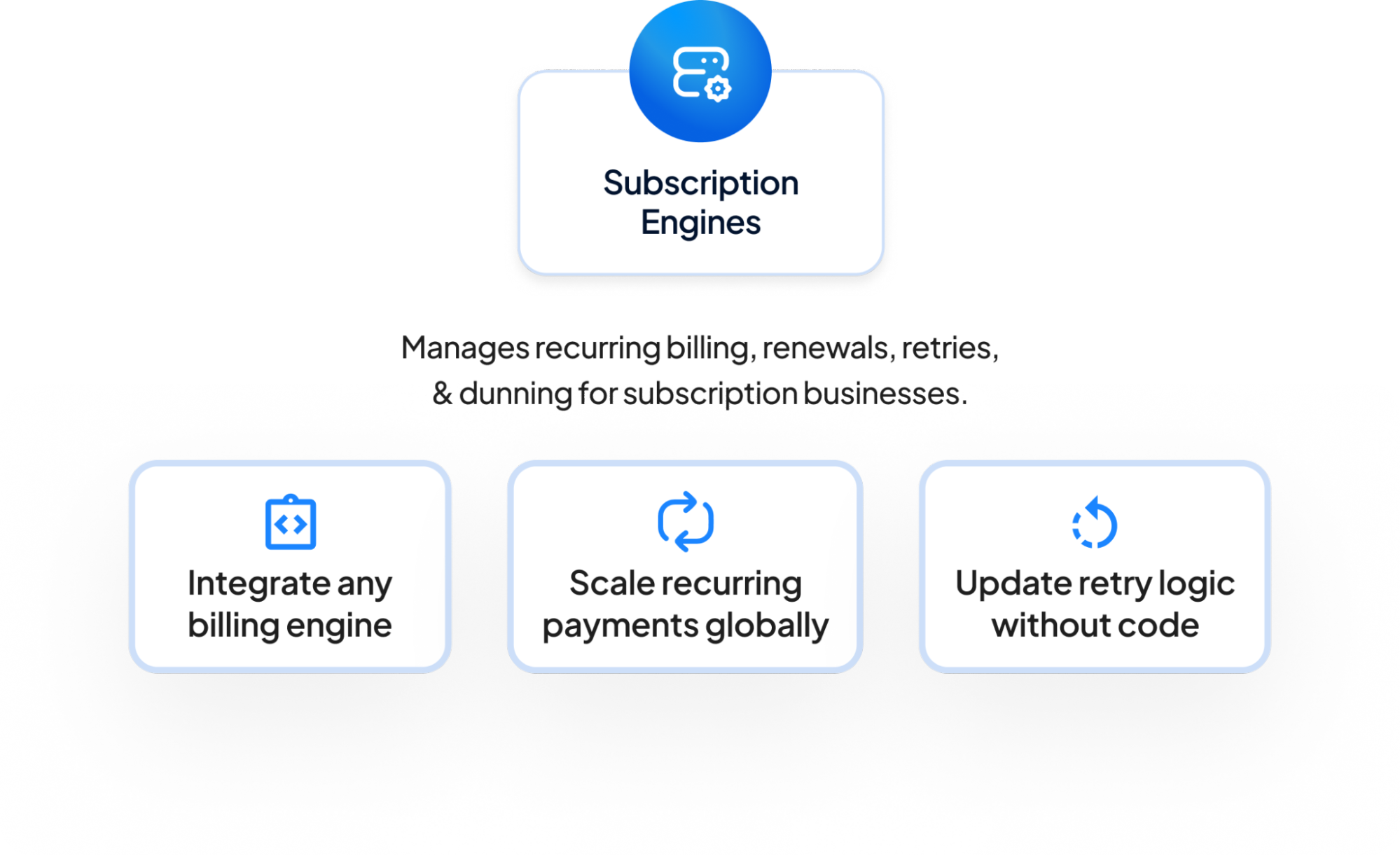 Hyperswitch integrates with different subscription engines and decouples billing from payments. Your subscription provider continues to manage the ledger, scheduling, and invoices, while Hyperswitch takes full control of payments, vaulting, retries, routing, and multi-provider orchestration. Businesses have better control with recurring payments, reliability with failover and routing options, and improved authorization rates and costs with a configurable intelligent routing system.