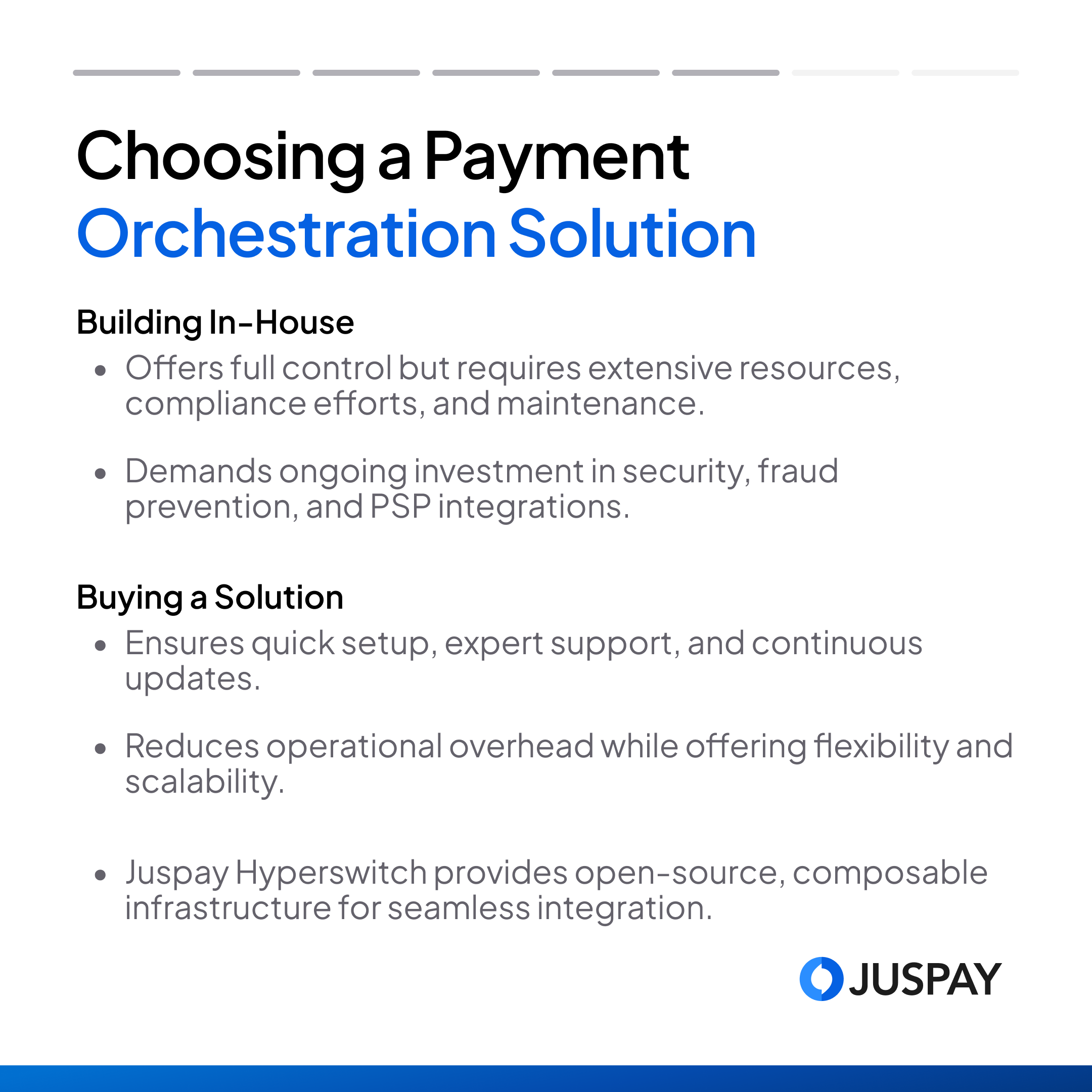 While in-house payment orchestration platforms can provide more control over the systems and security, they require a significant investment of time, money, and technical expertise. This can pull focus away from your core business activities. However, it's worth noting that modern payment orchestration platform providers like Juspay Hyperswitch, offer robust security and compliance, making them a strong alternative. Juspay Hyperswitch is an independent, open-source and composable solution that is built to offer utmost control to the merchants.