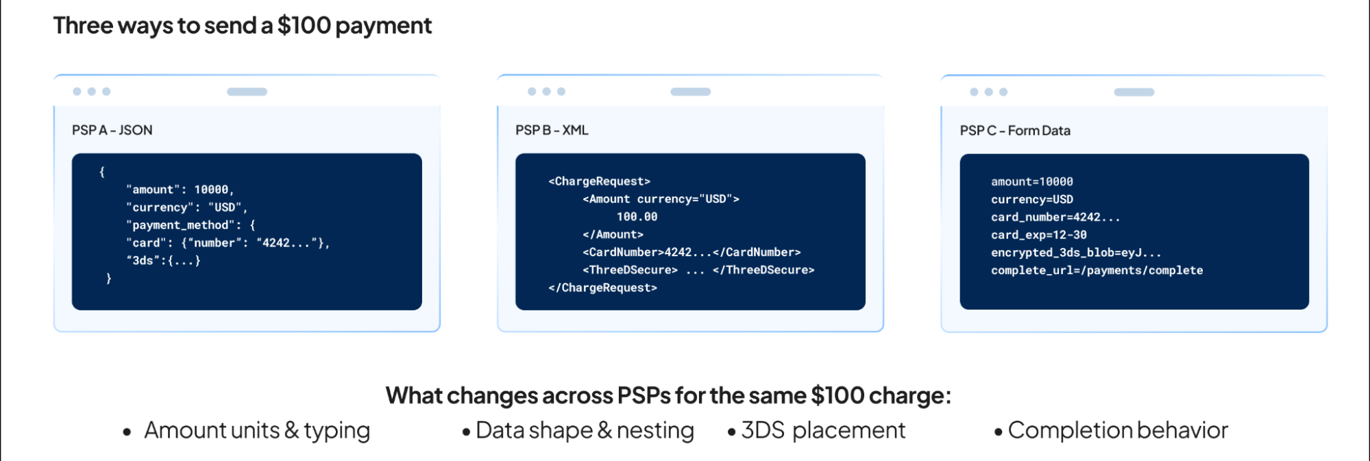 - Endpoint layouts: For the same logical action (let’s say a charge operation), one PSP might use `/payments`, another `/charges`, and a third `/transactions` each with its own request and response shape.