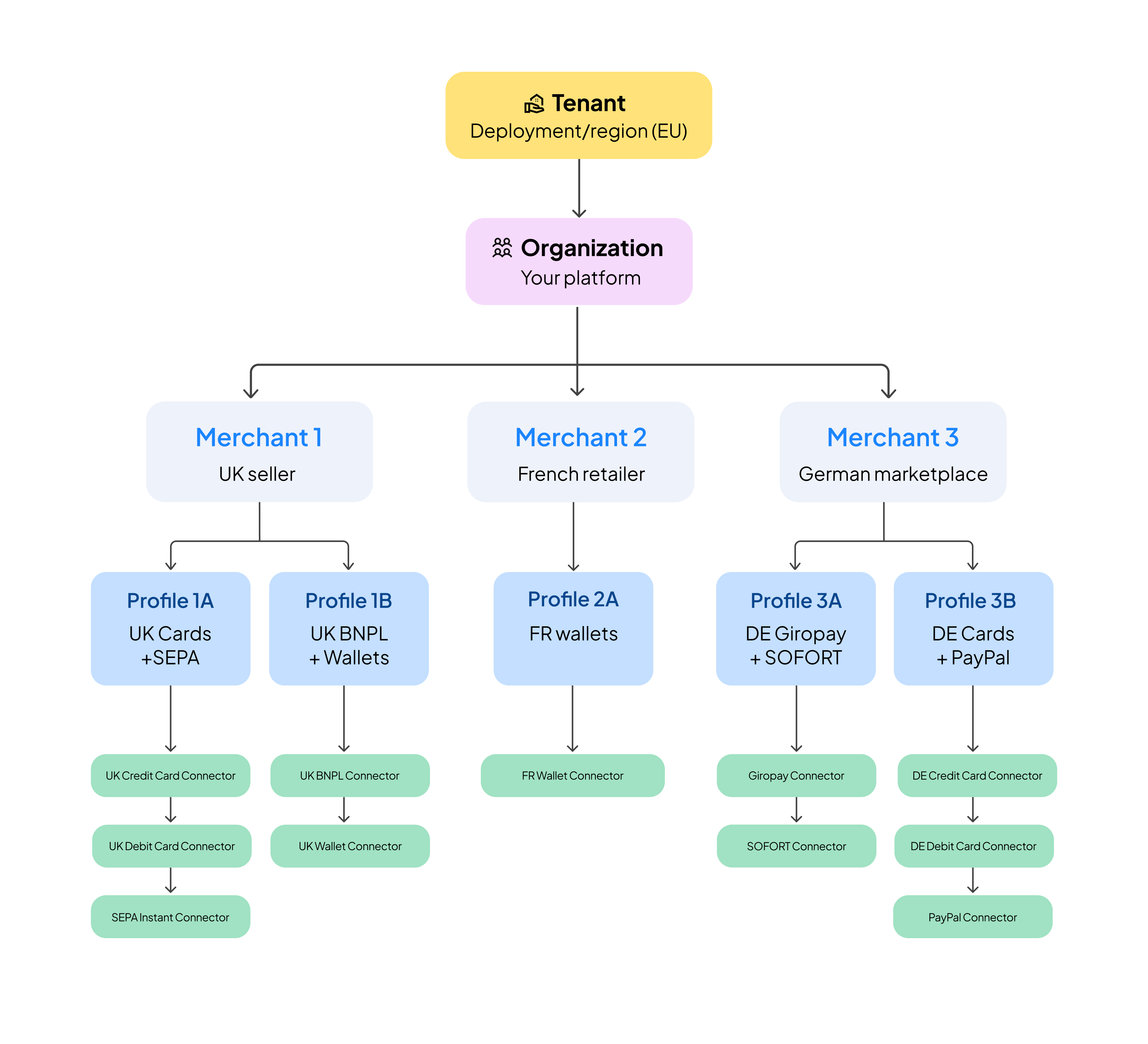 The Tenant → Organization → Merchant → Profile model gives you clean boundaries at every layer, so you can support BYO PSP, multi region, and multi-brand setups without re- architecting your core. Each payment executes in exactly one Profile, rolls up cleanly through the hierarchy, and preserves isolation for keys, data, routing, and operations by design.