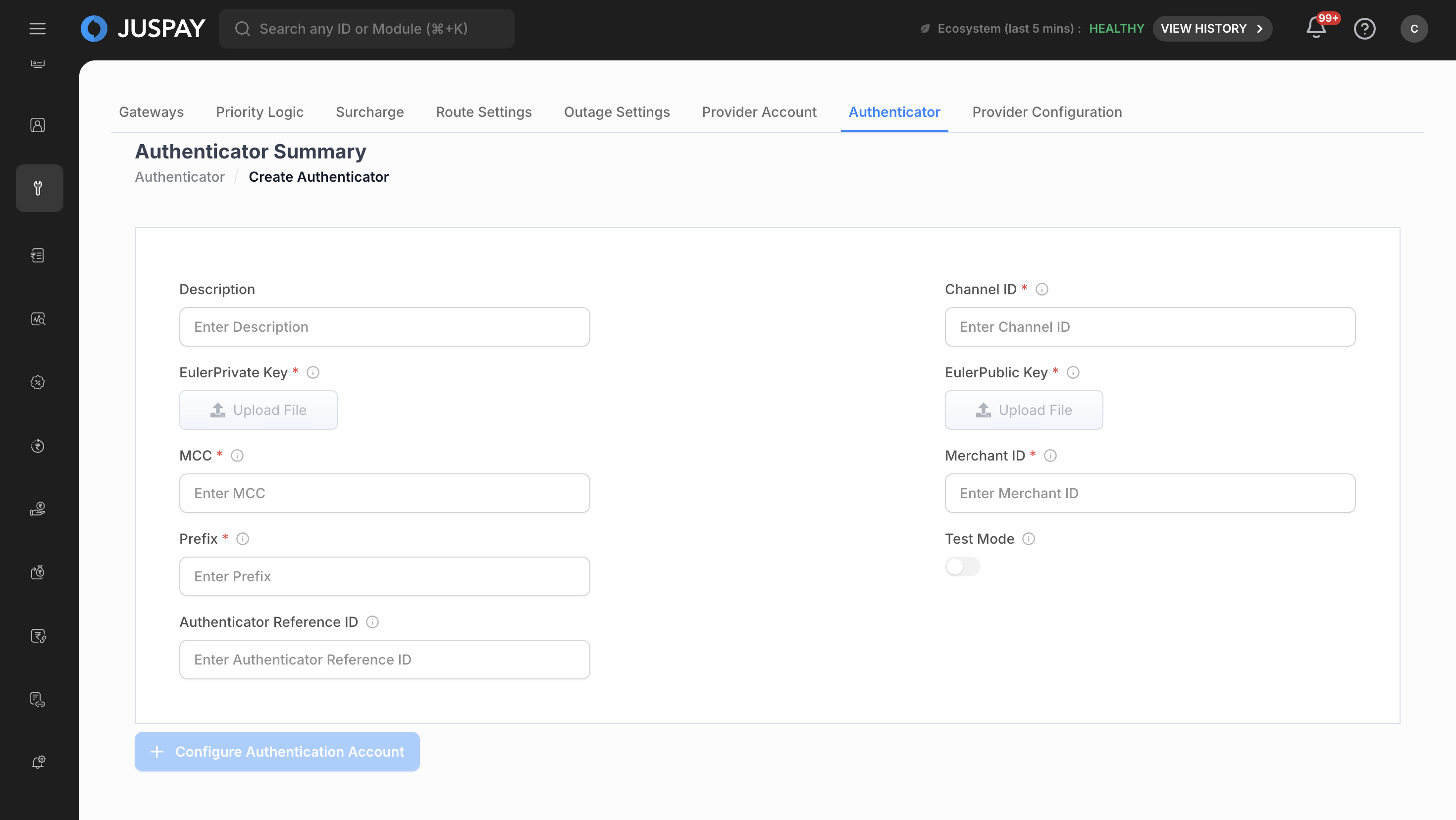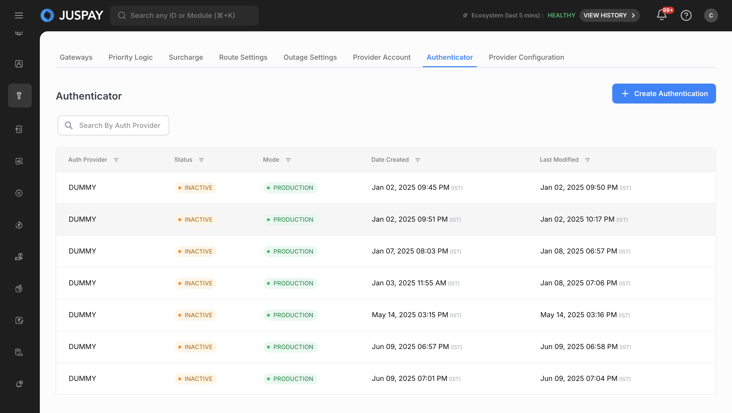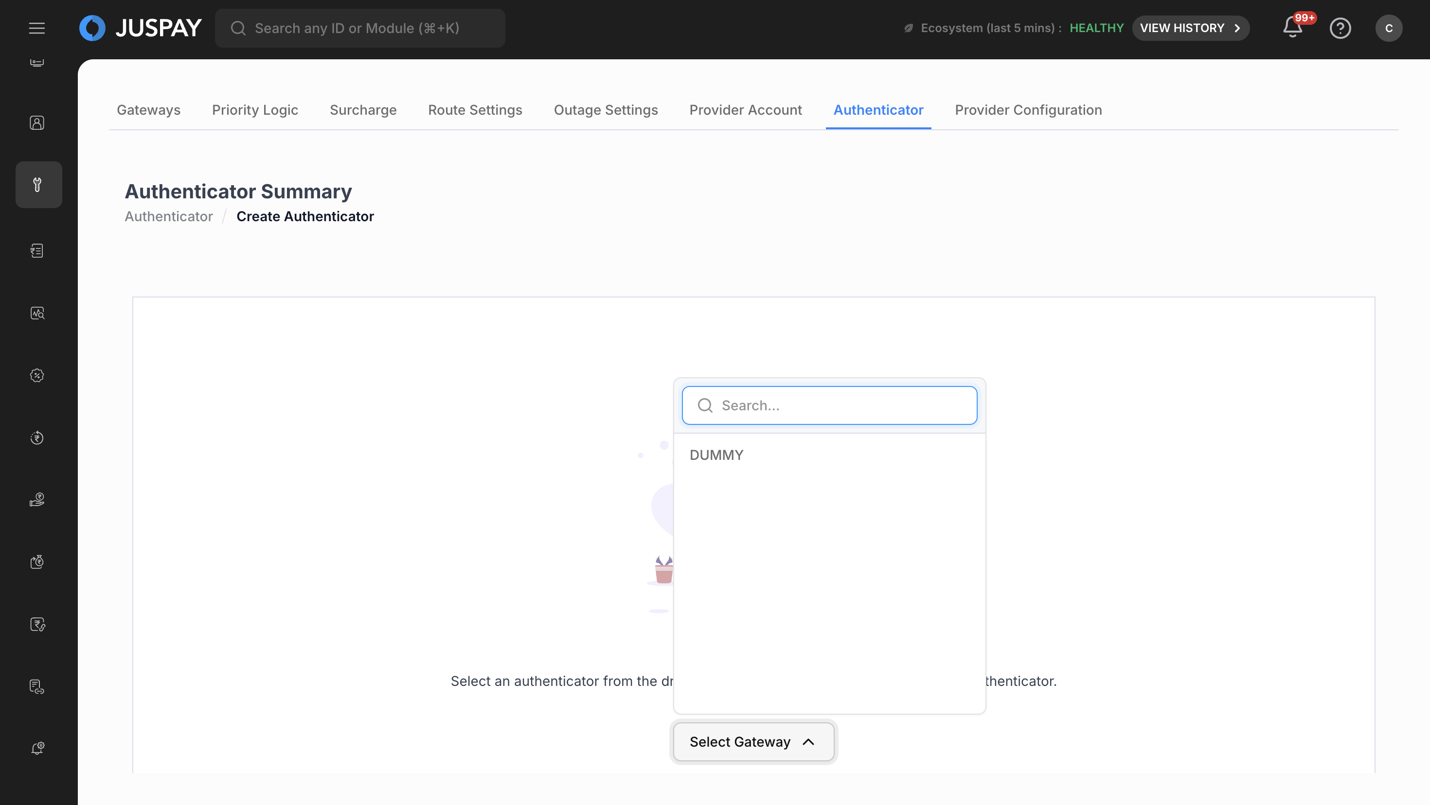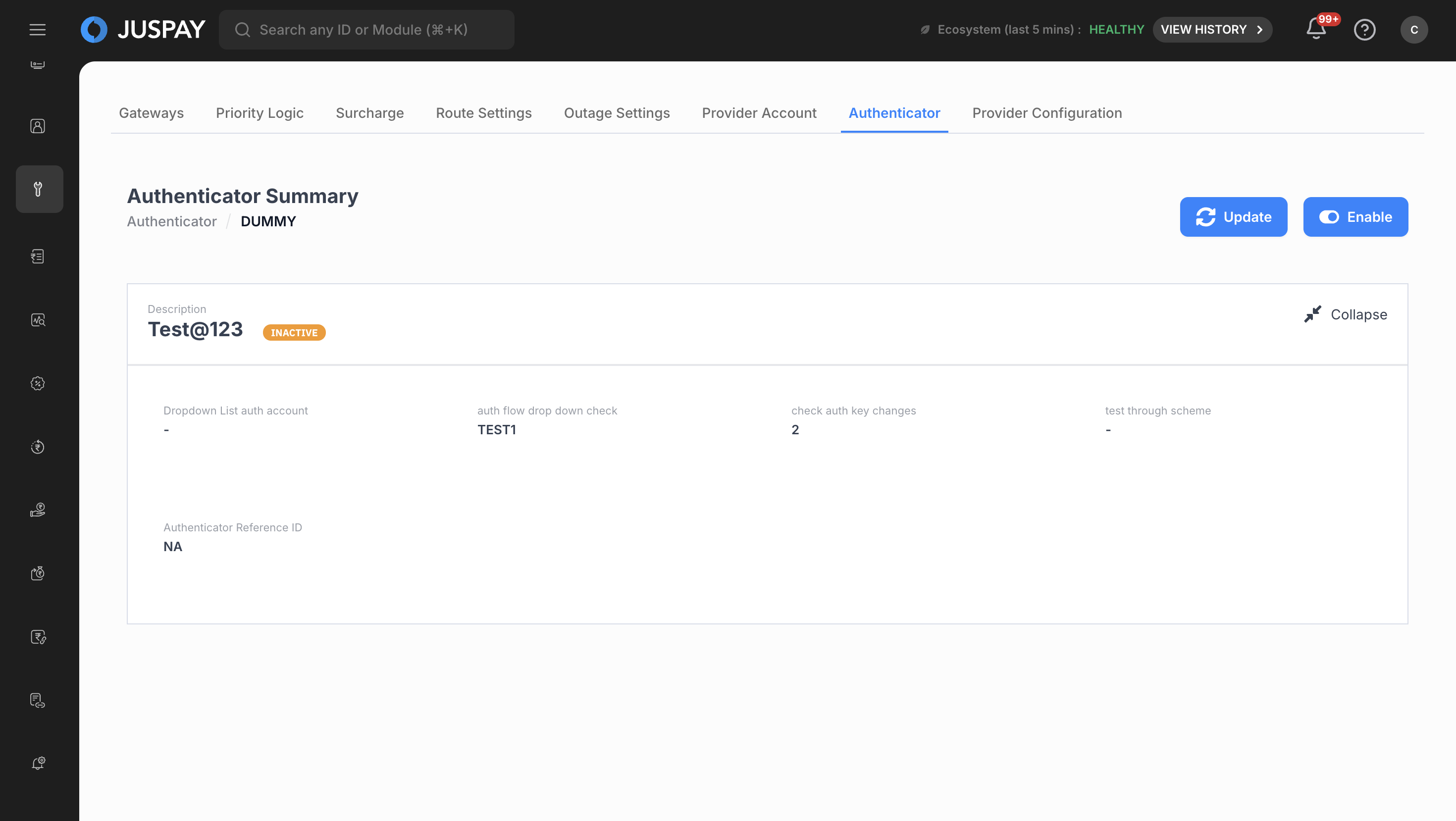 The Authenticator feature allows administrators to configure and manage authentication providers for secure payment processing. This includes setting up various authentication providers, managing their status, and configuring provider-specific settings. This feature is primarily intended for operations teams, finance teams, and customer support users with the appropriate permissions to manage authentication configurations.
