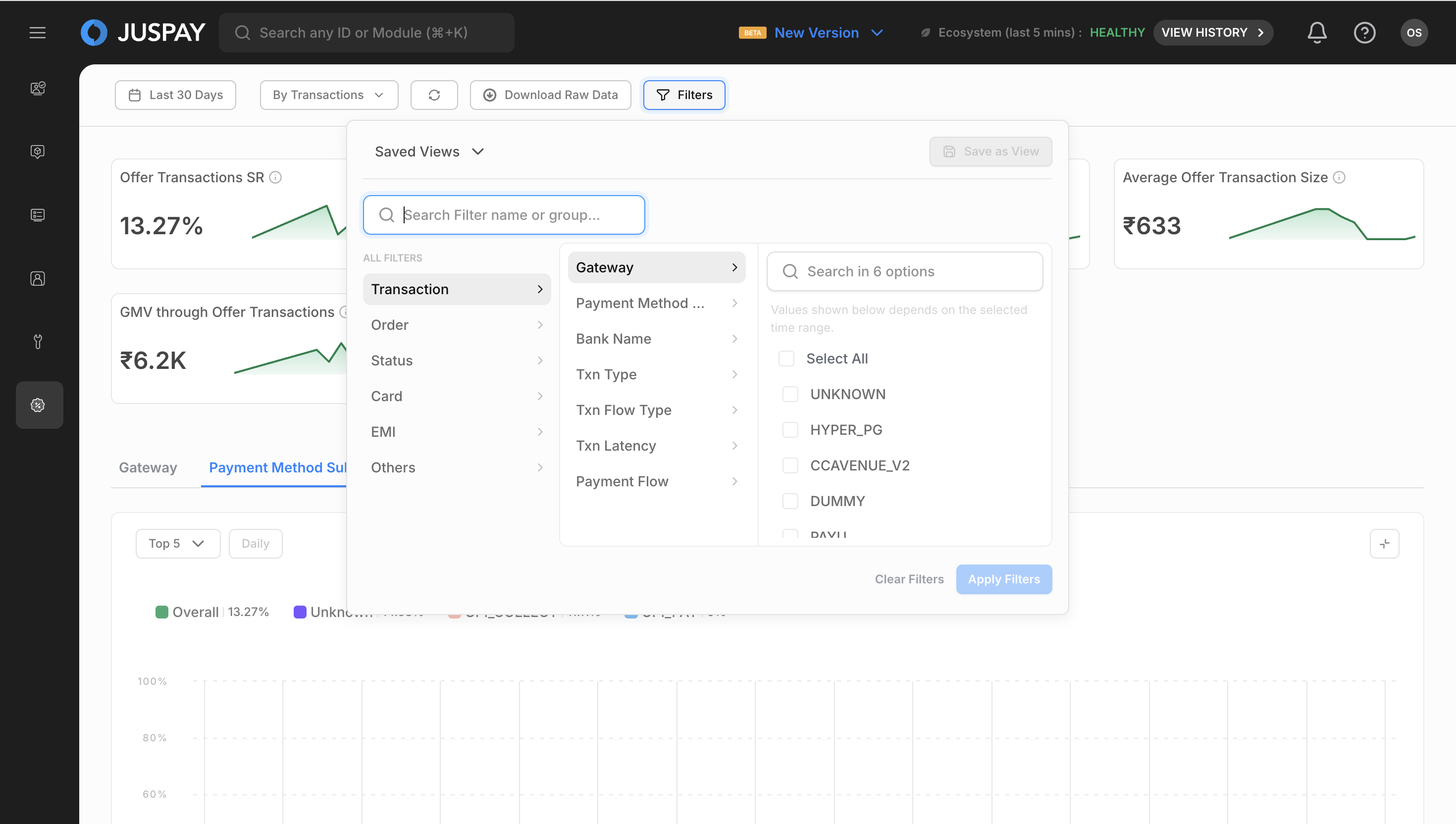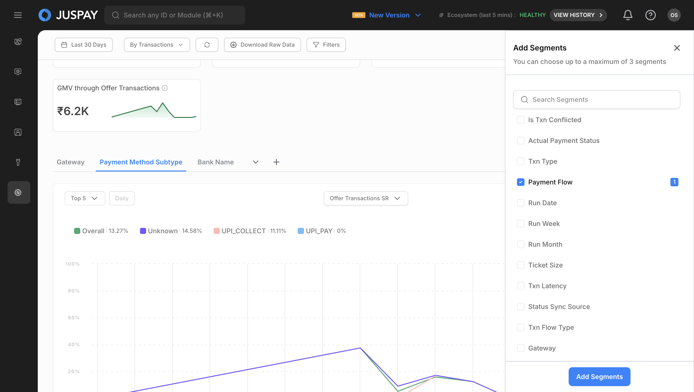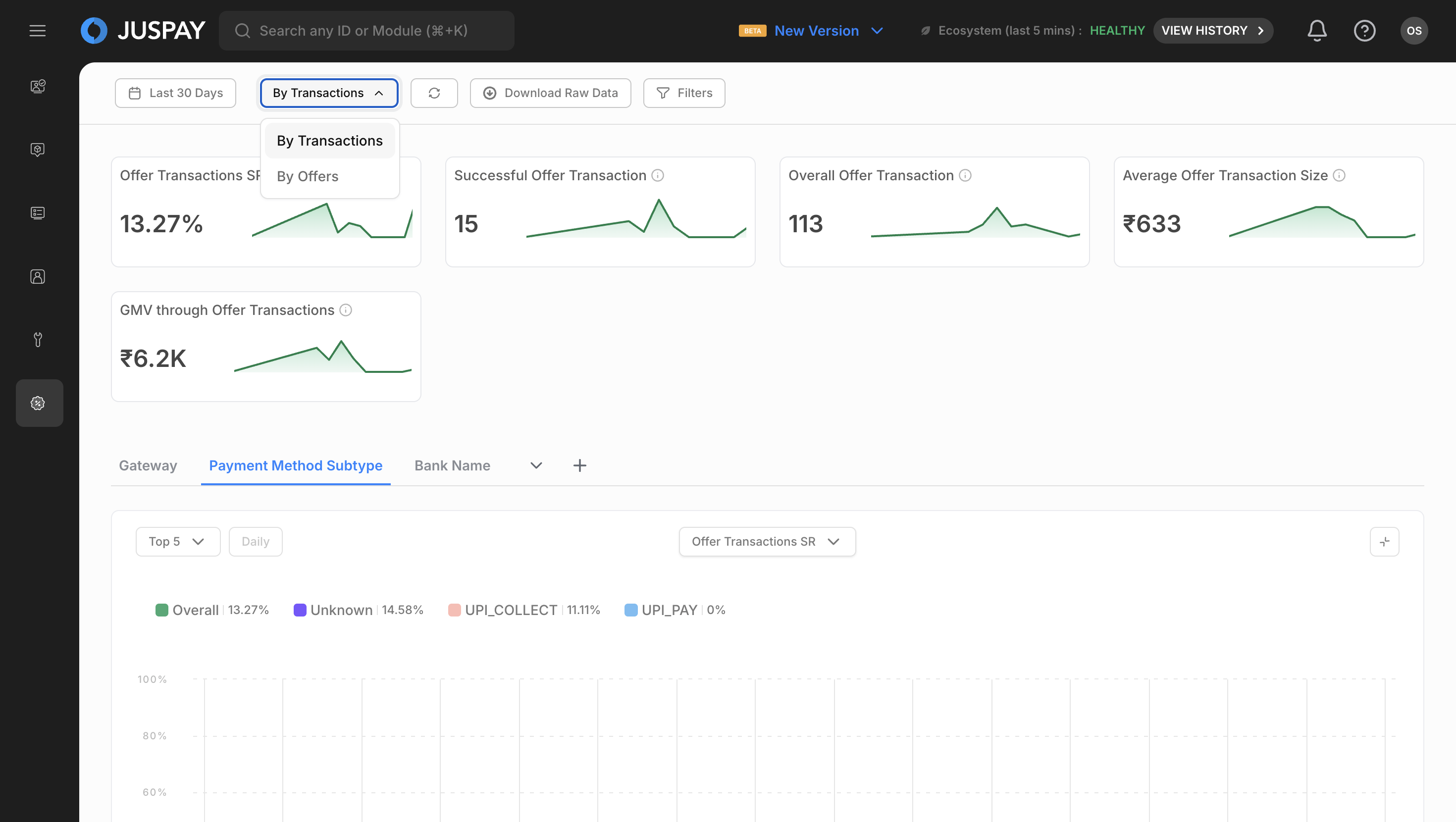 The Offers Analytics module provides comprehensive insights into offer performance and offer-related transactions within the Juspay payment platform. It offers real-time and historical analysis of offer effectiveness, success rates, benefit amounts, and detailed breakdowns across various business dimensions with multiple viewing modes for different analytical perspectives.