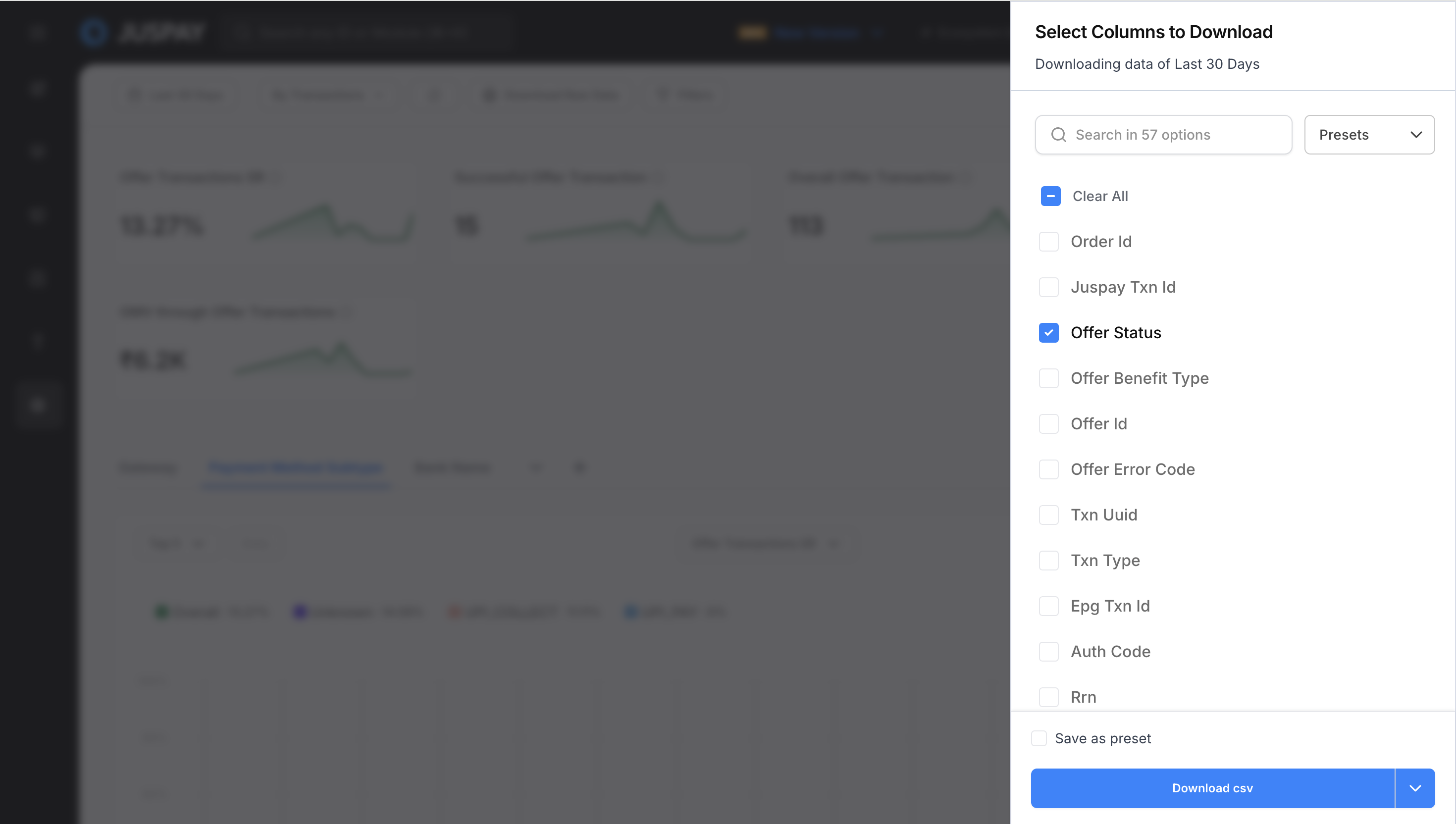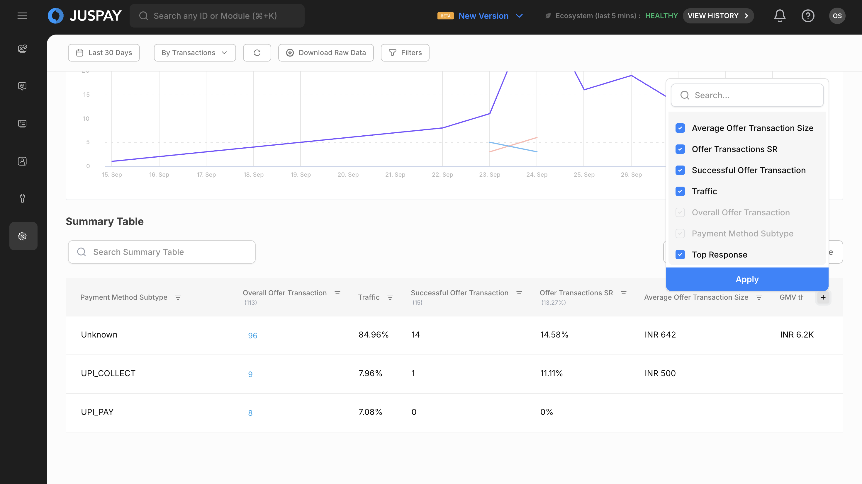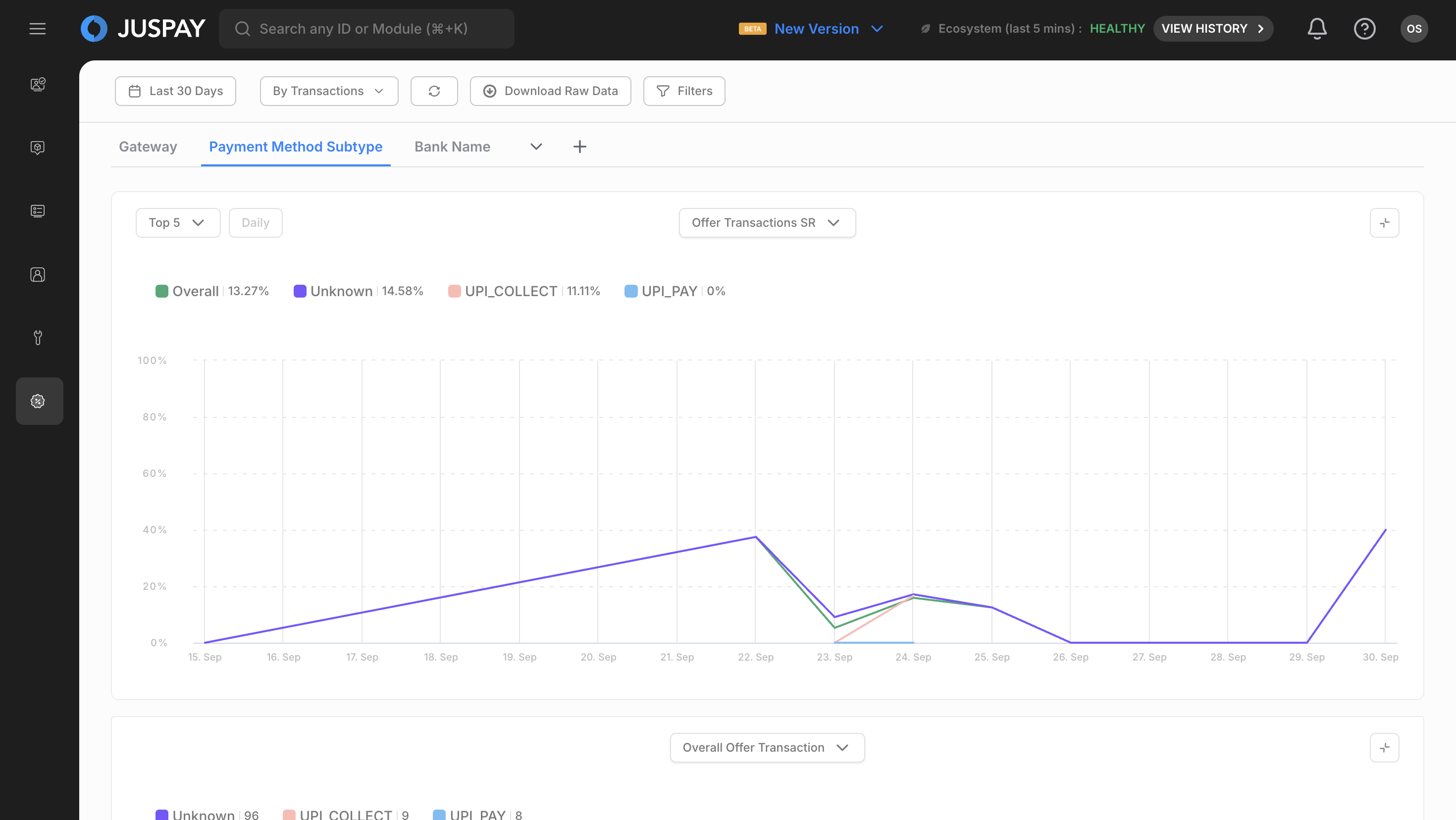 The Offers Analytics module provides comprehensive insights into offer performance and offer-related transactions within the Juspay payment platform. It offers real-time and historical analysis of offer effectiveness, success rates, benefit amounts, and detailed breakdowns across various business dimensions with multiple viewing modes for different analytical perspectives.