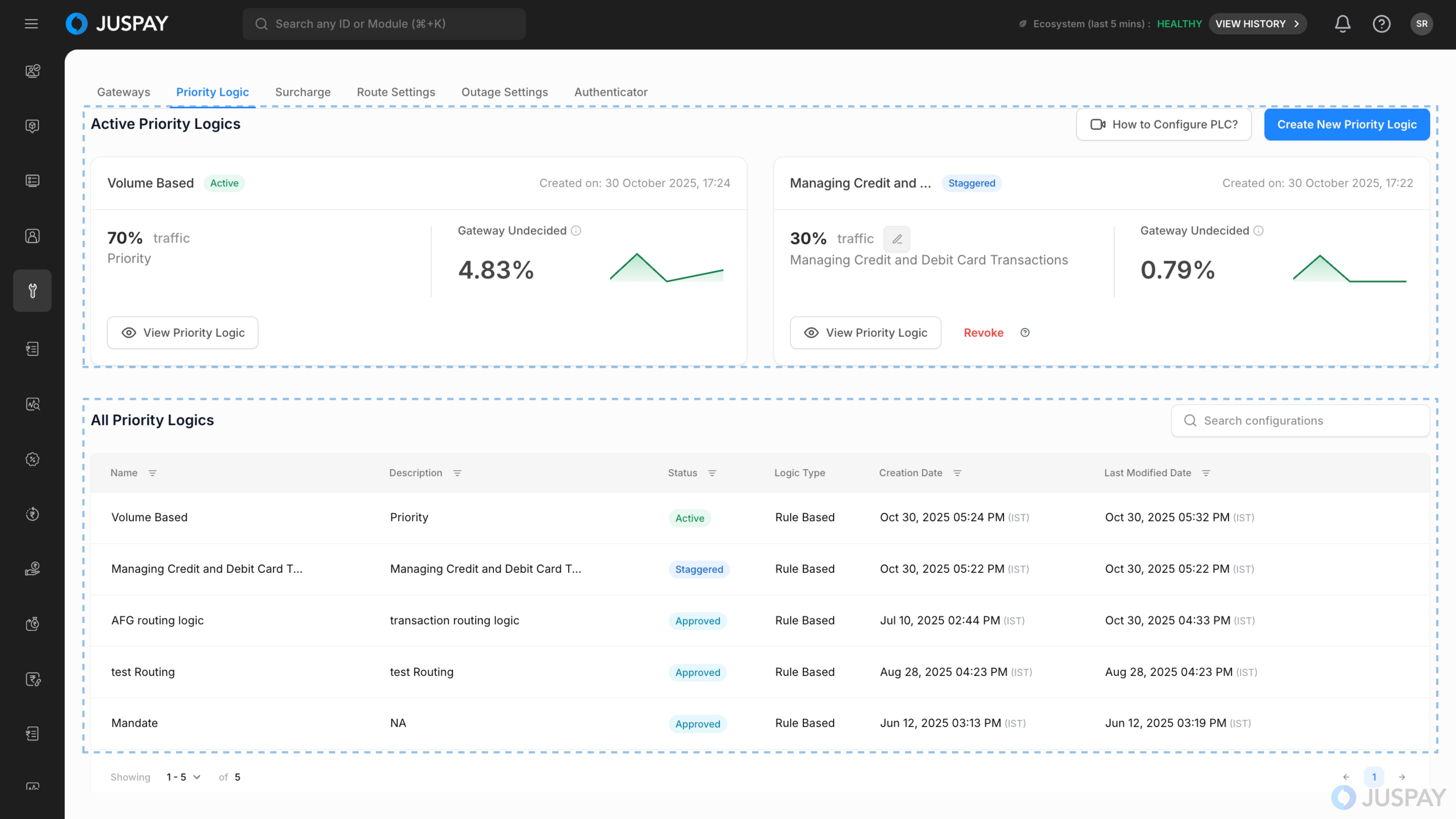 Juspay Dashboard → Payments → PG Control Center → Priority Logic