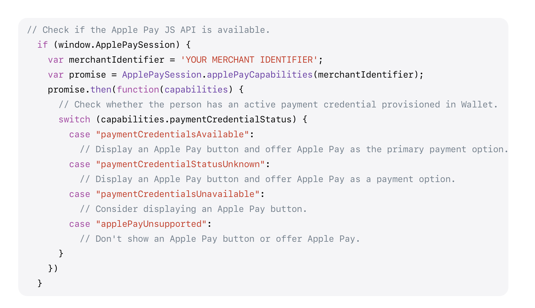 paymentCredentialsAvailableConfirms that the device supports Apple Pay and there’s at least one active payment credential in Wallet that qualifies for payments on the web. Show an Apple Pay button and offer Apple Pay as the primary, but not necessarily sole, payment option.