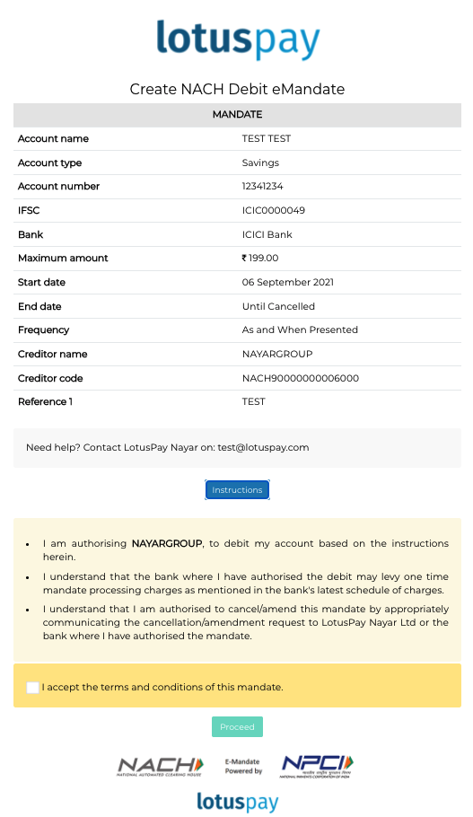 Step 1. Read the NACH Debit consent and check your details, then click Continue.