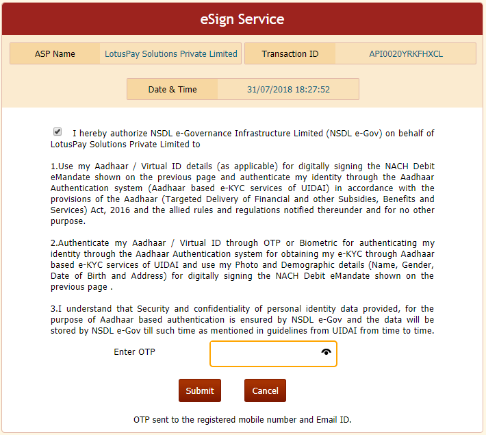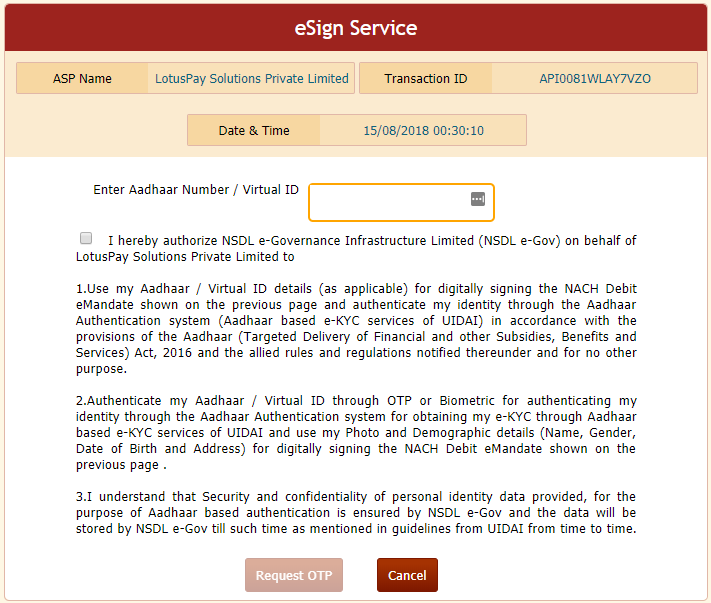 Step-by-step guide to authorising an NACH Debit eMandate via Aadhaar eSign on LotusPay.