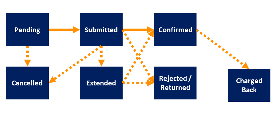 All transactions start in this status. The transaction has been created but hasn’t yet been submitted to the banking system for processing. The transaction will be automatically submitted at the cut-off time on the charge date. You can still cancel transactions while they are pending.
