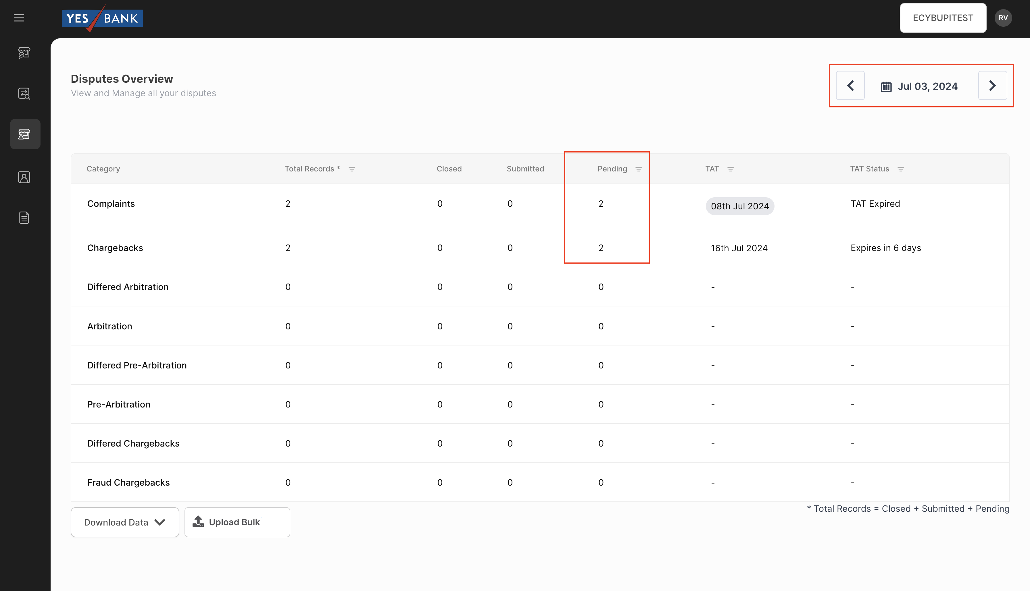 Clicking on the pending count of a category will display all the pending disputes of that particular category.