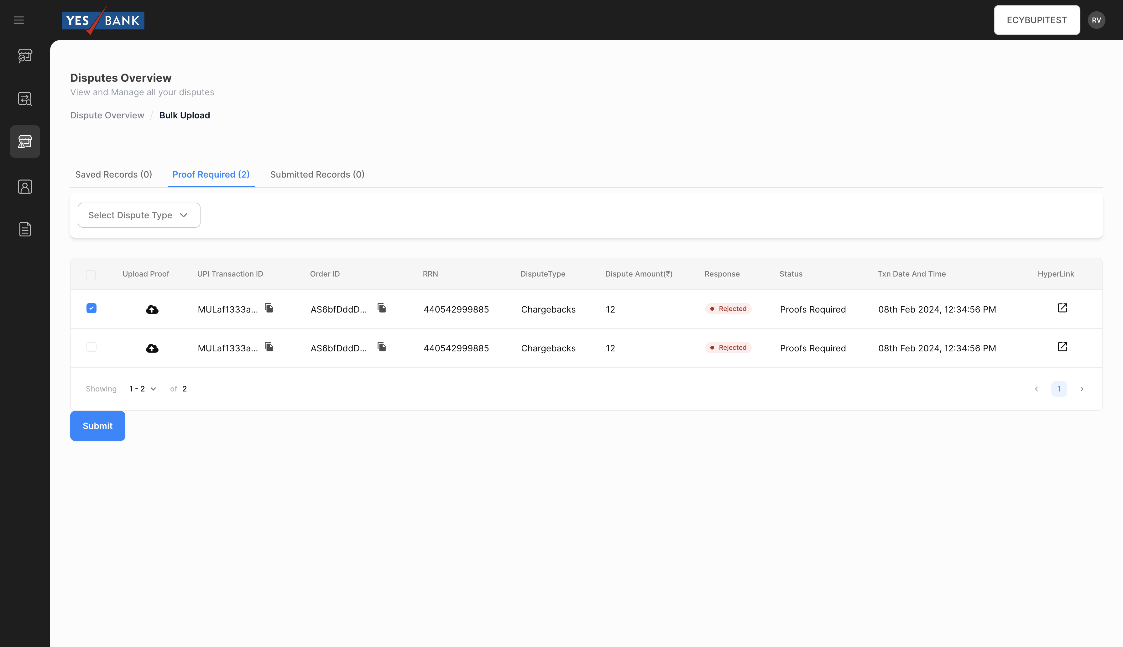 After saving, the transactions will be listed in the ‘Saved Records’ option. Here Merchants will have to select the transactions that they wish to submit and click on ‘Submit’. Once submitted, merchants can make no further changes. A pop up message will appear asking for confirmation.
