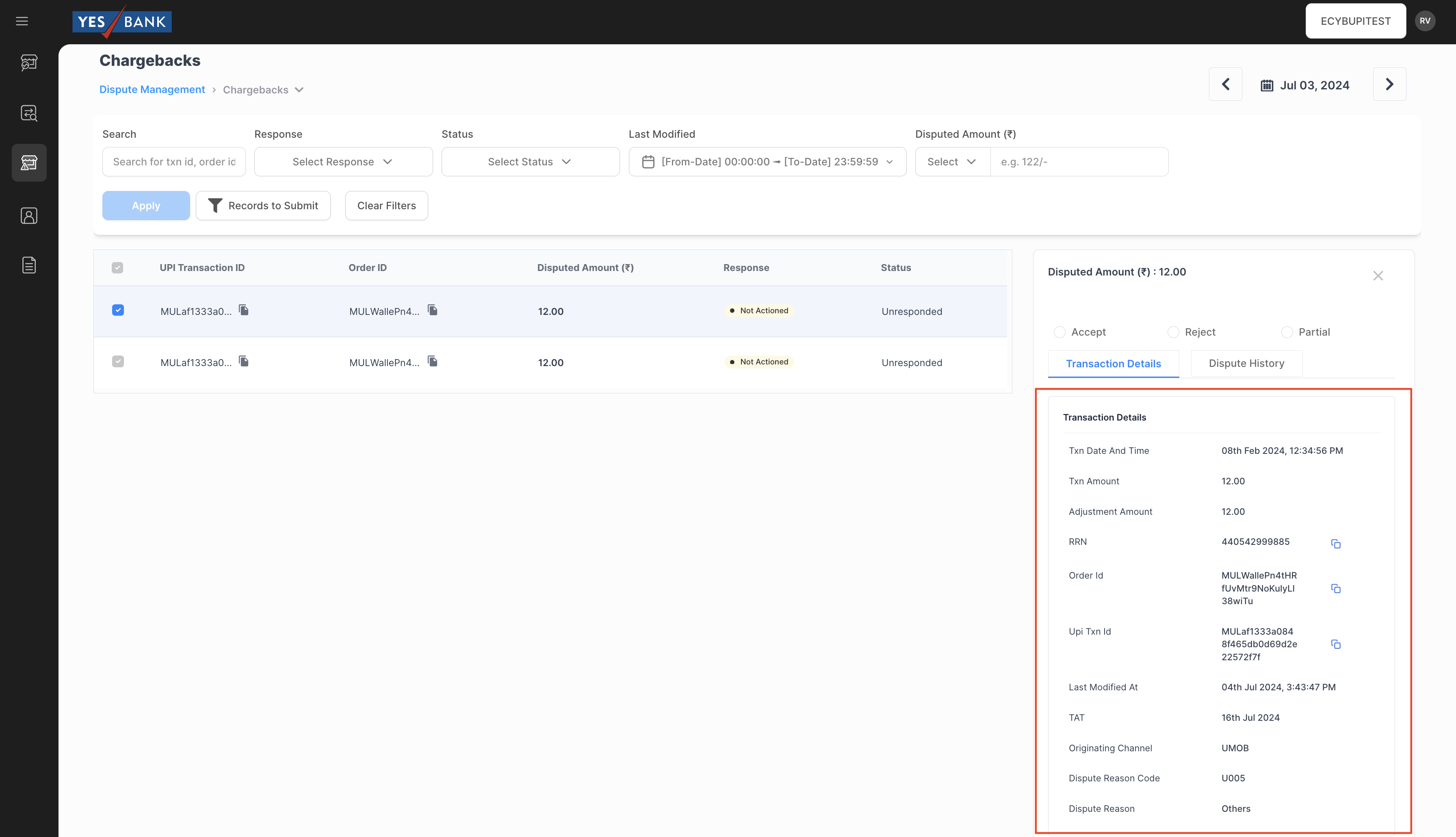 Further by clicking on an individual transaction, a detailed tab encompassing all essential information of the disputed transaction will be open to the right. This includes:
