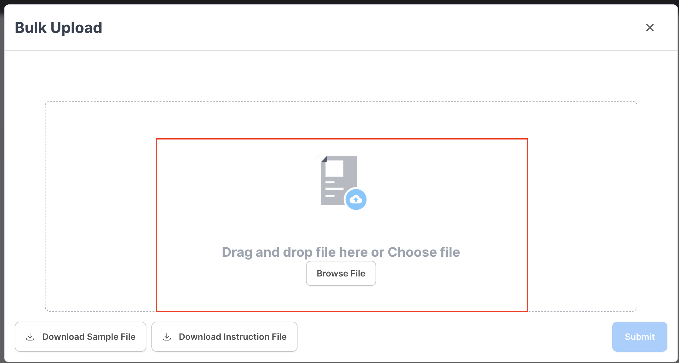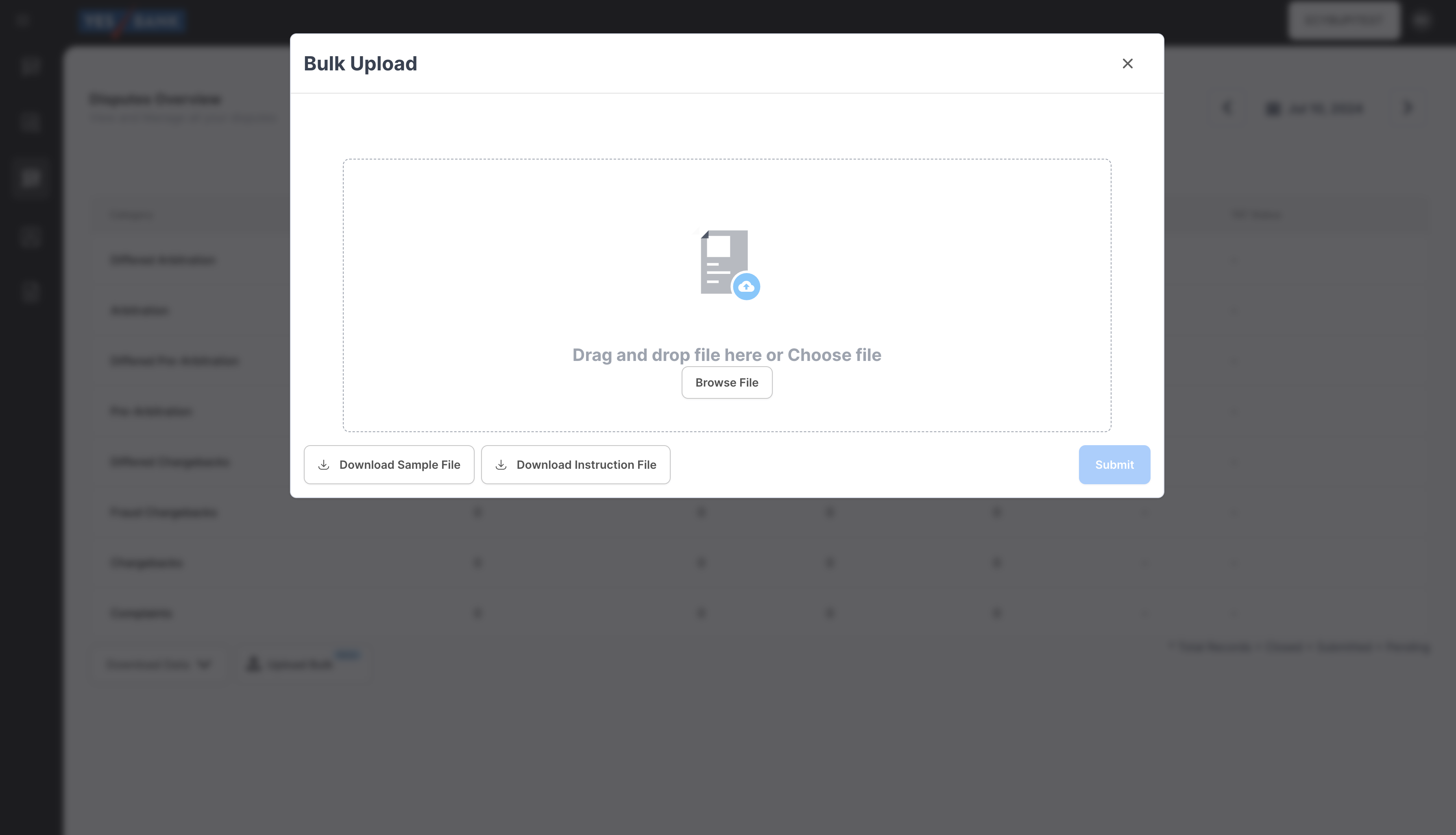 When clicked on the Upload Bulk option, merchants can download a Sample file format in which the file has to be uploaded and an Instruction file with all basic information on what is to be updated as response action, reason code, amount, etc. in the bulk upload file.Following are the steps to be taken for Bulk Operation: