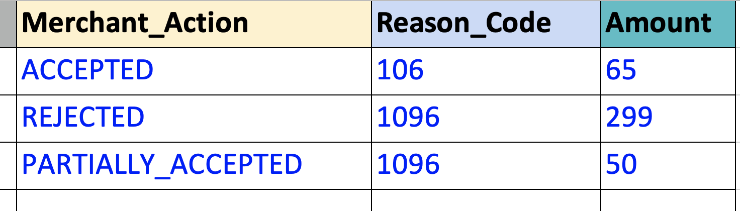 Note: Please do not edit any values apart from the last three columns present on the extreme right of the sample above with headers (Merchant_Action, Reason_Code, Amount)
