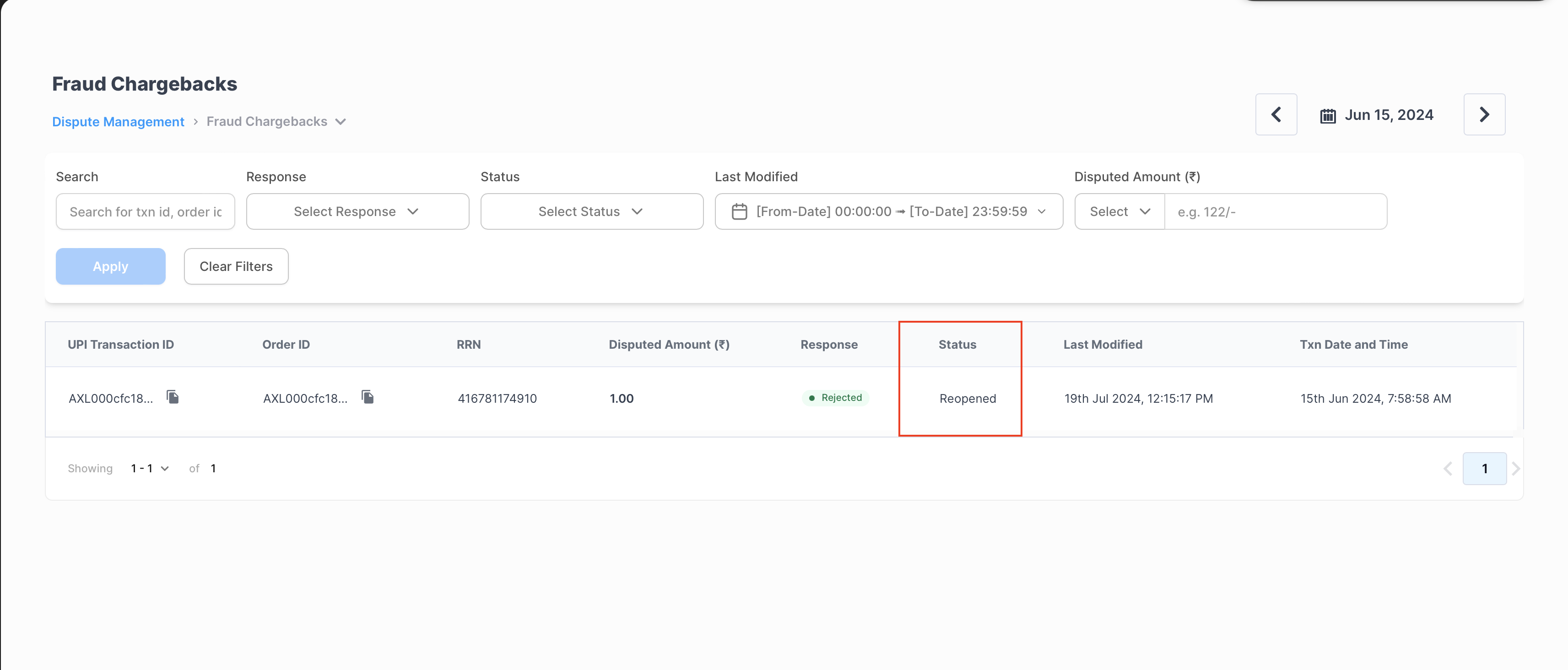 If the Juspay team finds that the response received is incorrect or the proof does not match with the disputed amount, the dispute will be reopened to the merchant with the status being changed to ‘Reopened’ The action has to be taken before the original TAT of that dispute.
