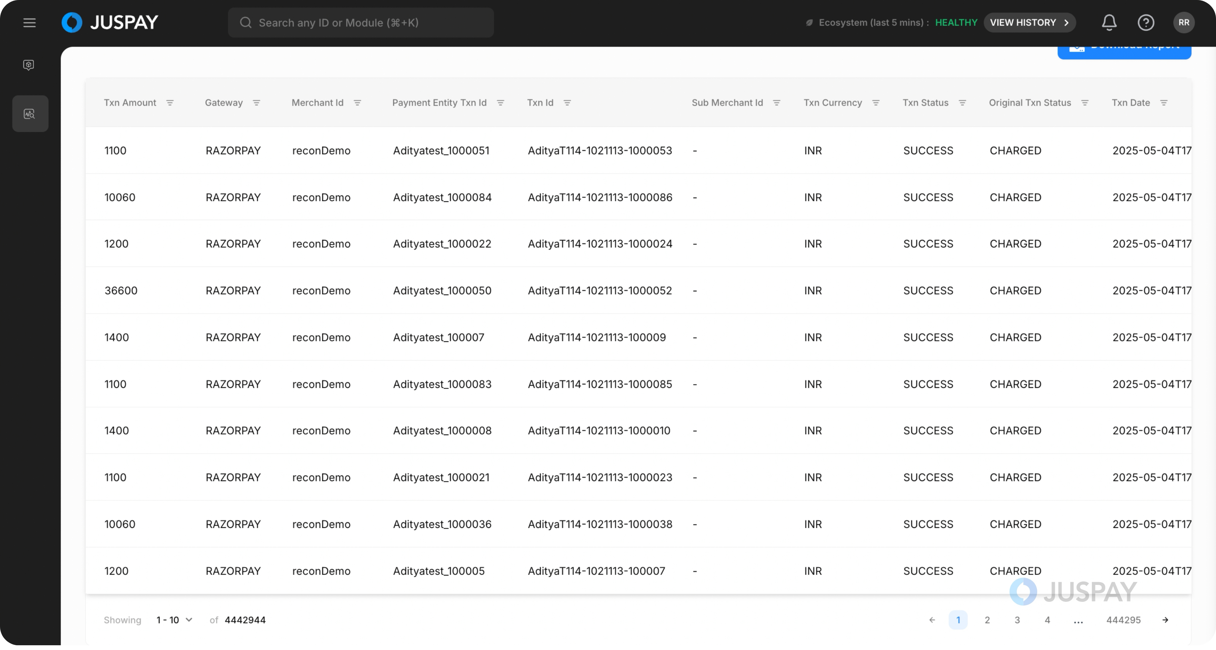 The Reports under Recon & Settlement module in the Juspay Dashboard helps merchants track and reconcile payments with full visibility into transactions, settlements, refunds, fees, and taxes. It simplifies financial operations by highlighting reconciled vs unreconciled transactions, showing net settled amounts, and offering downloadable reports for audits and accounting.