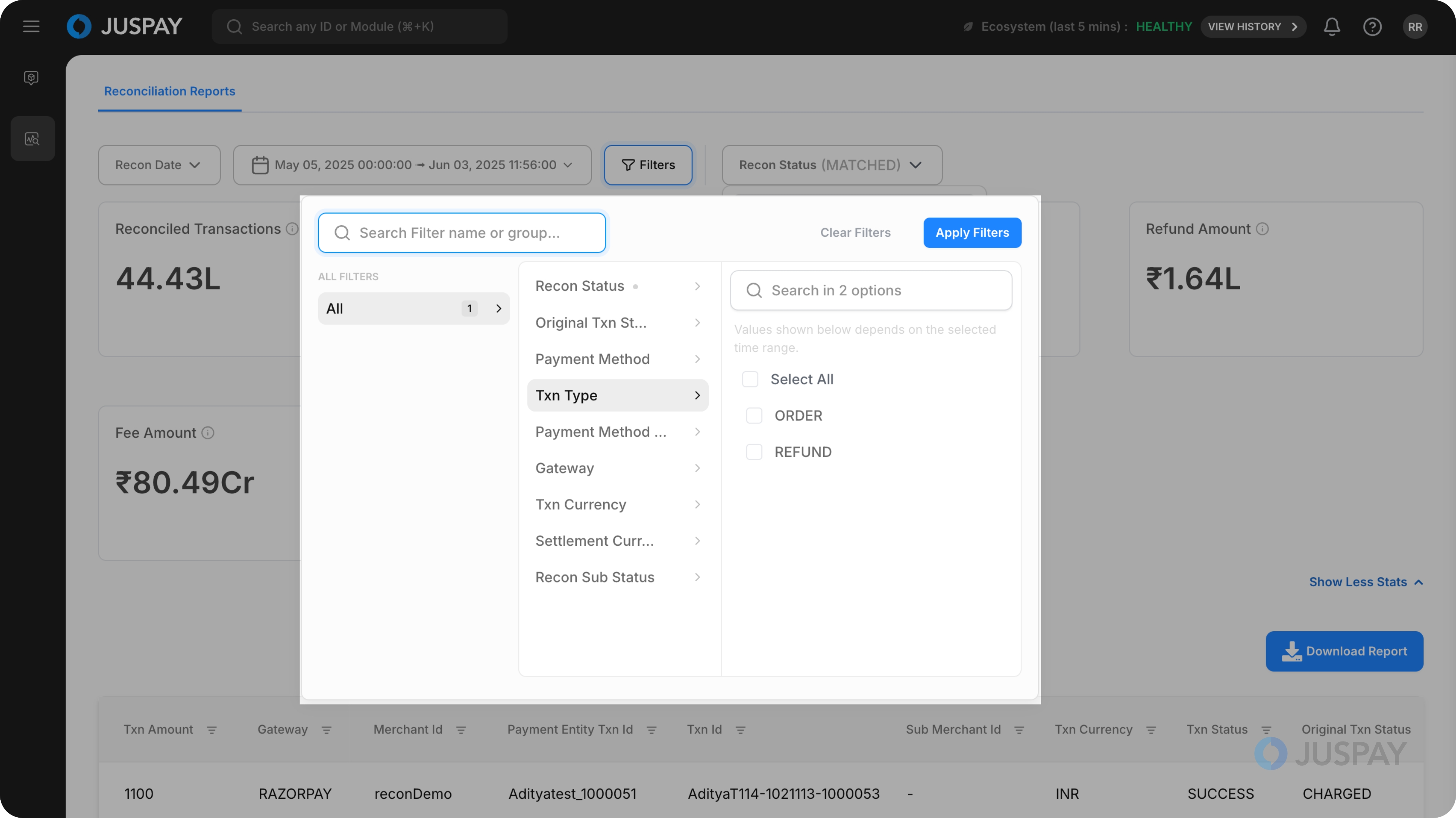 The Filters panel allows merchants to narrow down reconciliation data based on custom criteria. This is useful for targeted/ custom analysis and exception handling.
