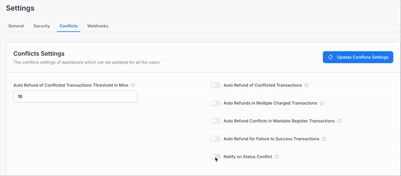 1. Go to your Juspay Dashboard > Payments > Settings > Conflict.