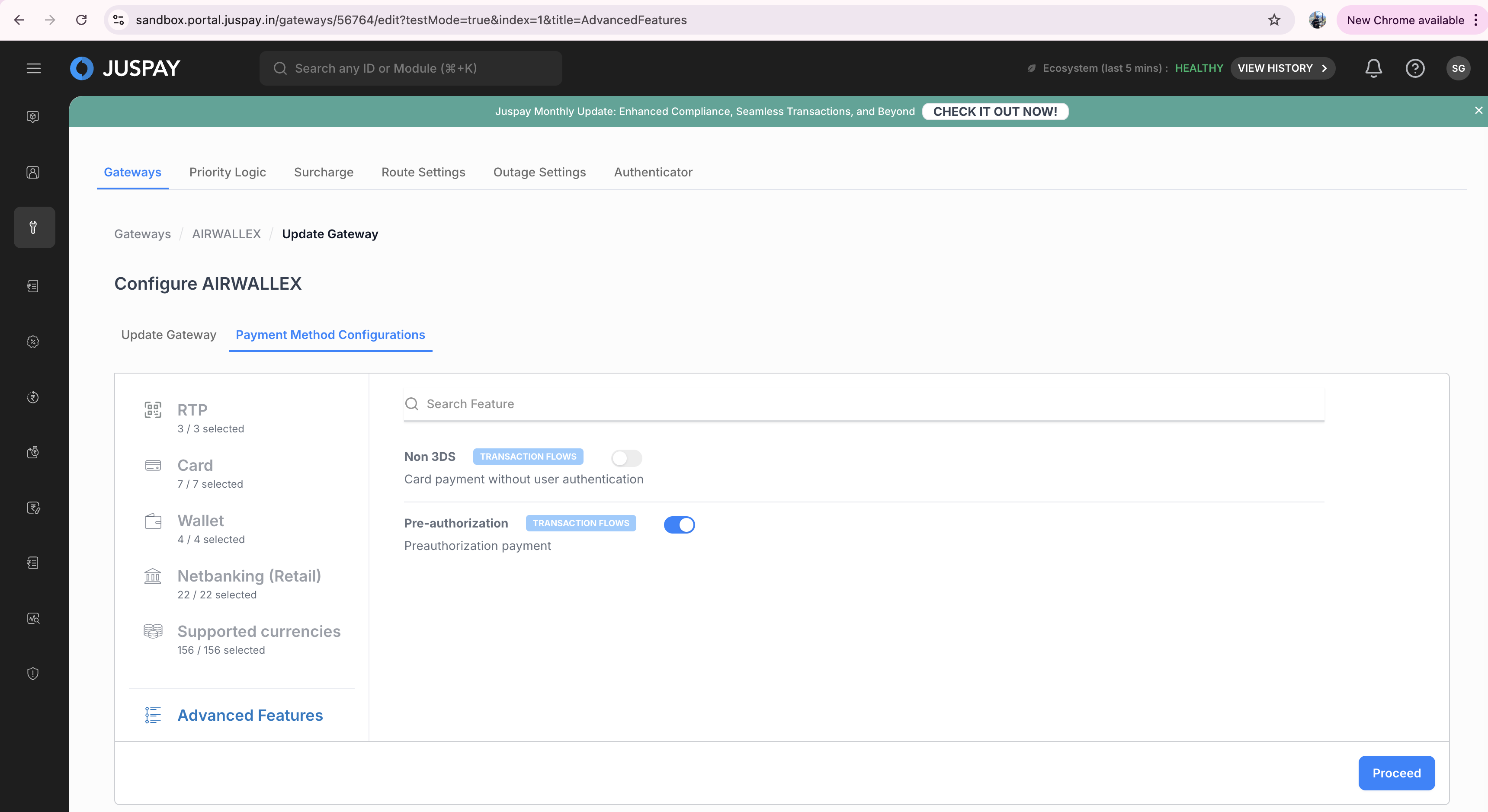 Login to Juspay dashboard → Navigate to Payments tab → Select PG Control Center → Select the No-3DS supported gateway → Go to Payment method configurations -> select Advanced Features and enable No-3ds toggle