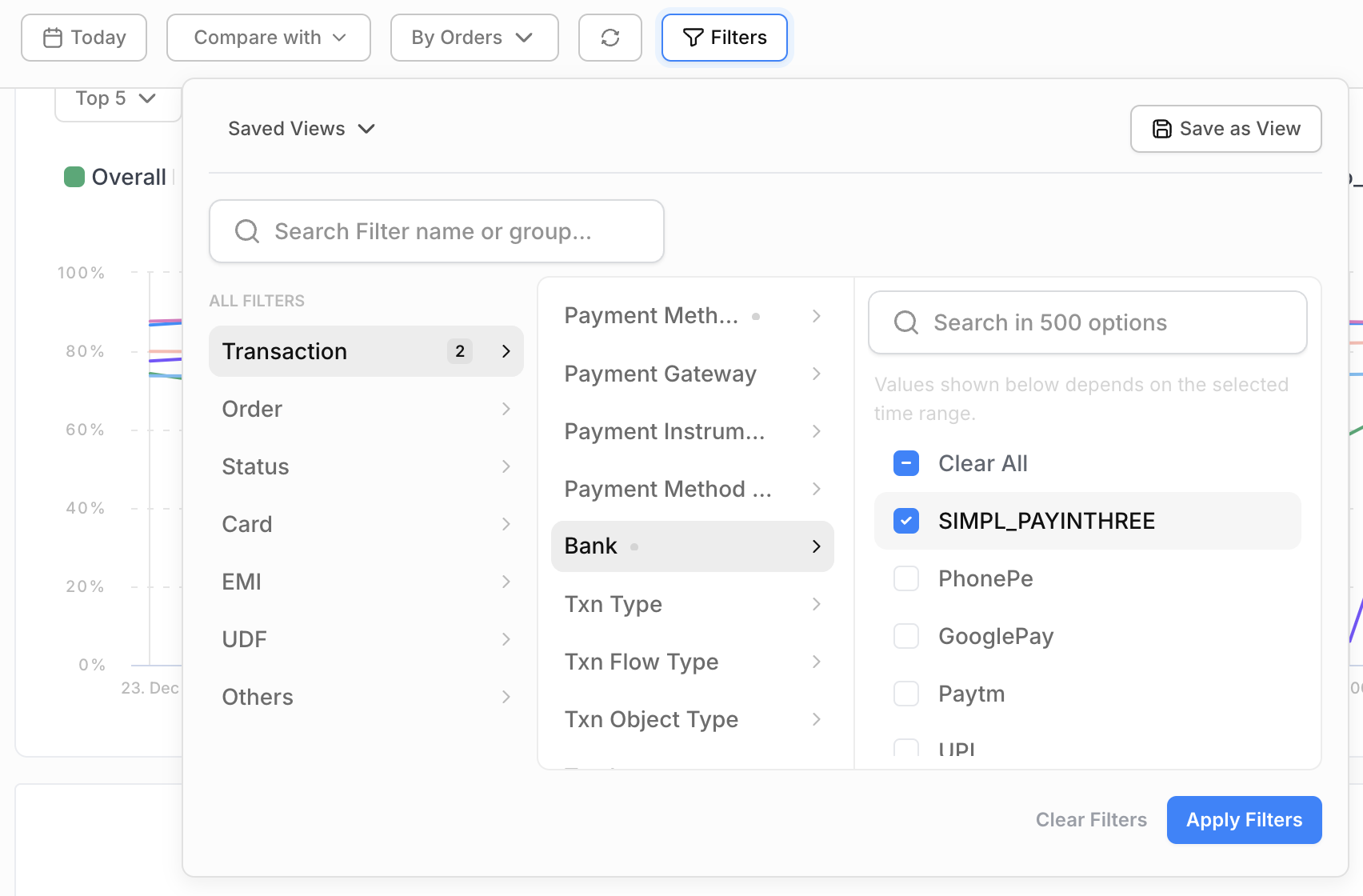 Merchants can use the Juspay Transactions Analytics Dashboard to check and analyze the volume and success rates of SIMPL Pay-in-3 transactions.