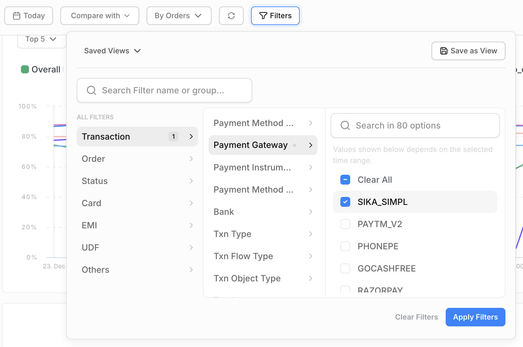 Use Payment Gateway filter and select 'SIKA_SIMPL' on the Juspay Transactions Analytics Dashboard for reviewing the Volume and SR for Simpl Pay-in-3 transactions.