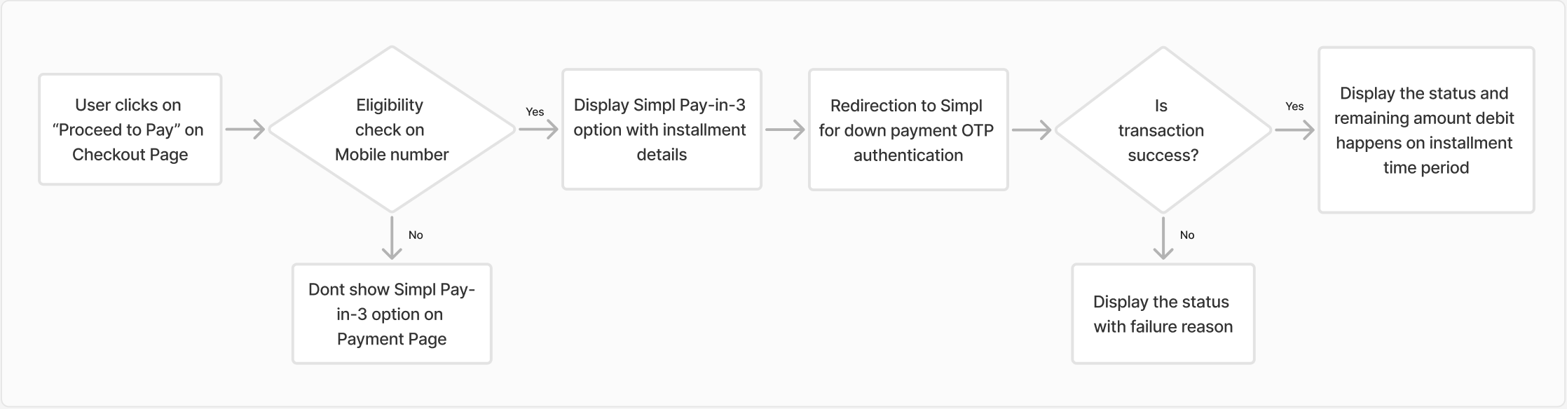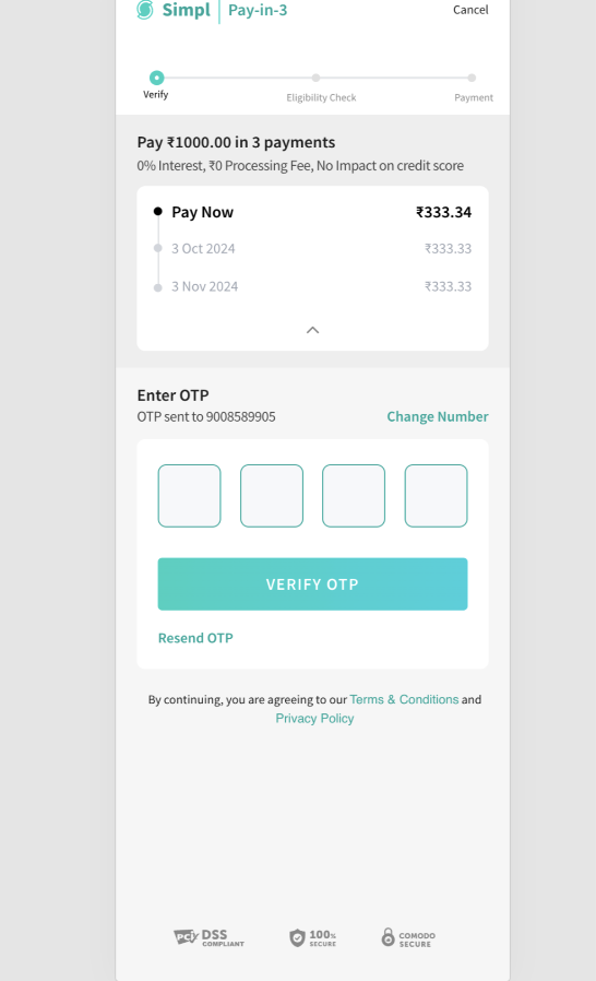Step 2: If user mobile number is eligible, Simpl pay-in-3 payment option is exclusively displayed to eligible users.